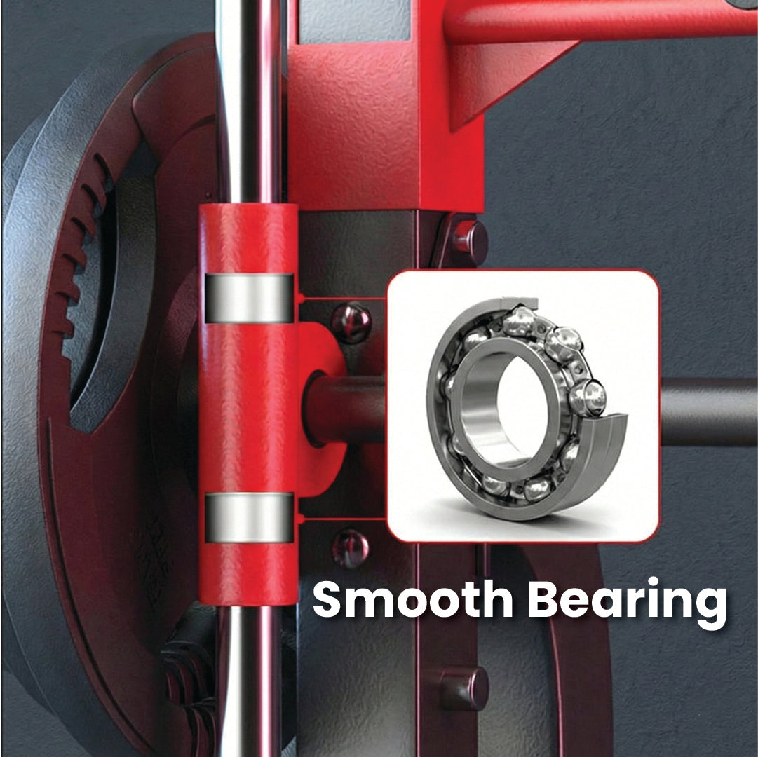Precision Engineering: Unlike standard racks that use plastic bushings, our Smith bar utilizes high-grade Linear Ball Bearings. This technology guarantees a silky-smooth travel path that eliminates friction, giving you the natural feel of free weights with the added stability of a machine.